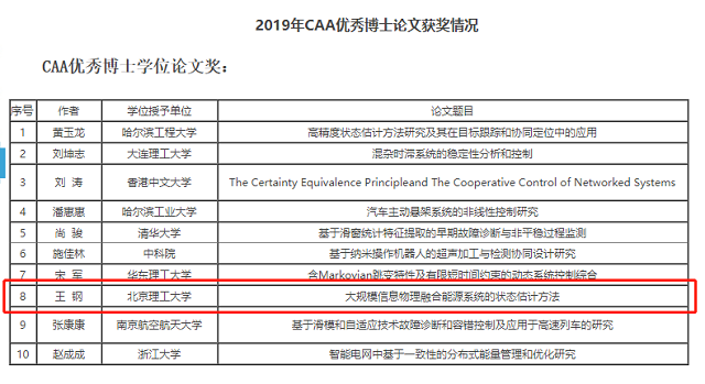 近日,北理工自动化学院陈杰教授指导的博士生王钢的博士学位论文《大规模信息物理融合能源系统的状态估计方法》获得CAA2019年优秀博士学位论文奖。